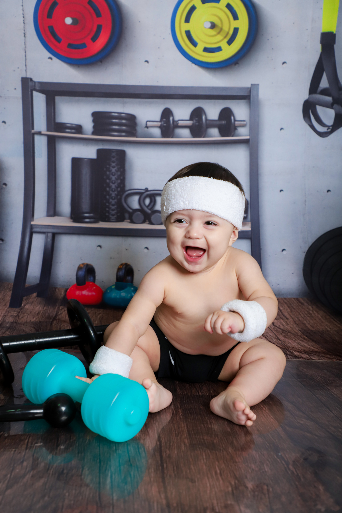 Ensaio mesversário do acompanhamento do José de 8 meses no estúdio Abacaxis Fotografia de Maternidade em Limeira-SP. Tema do ensaio foi academia e Monstros S.A.