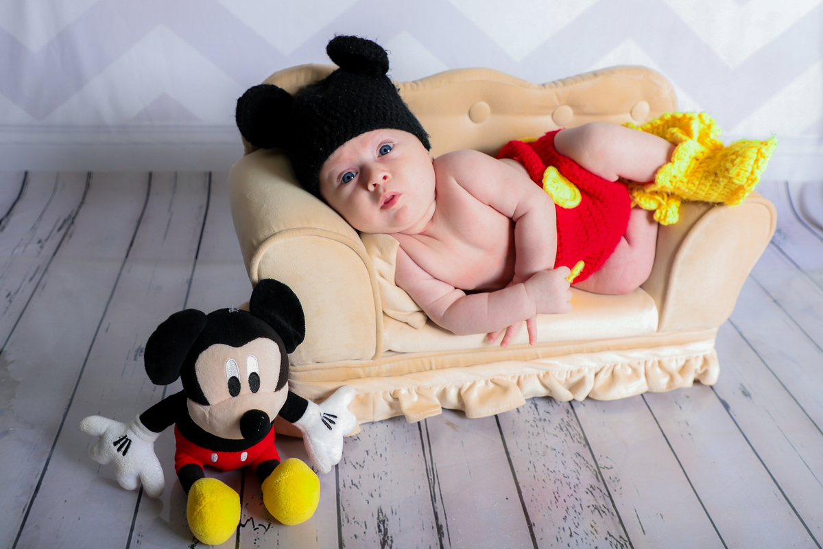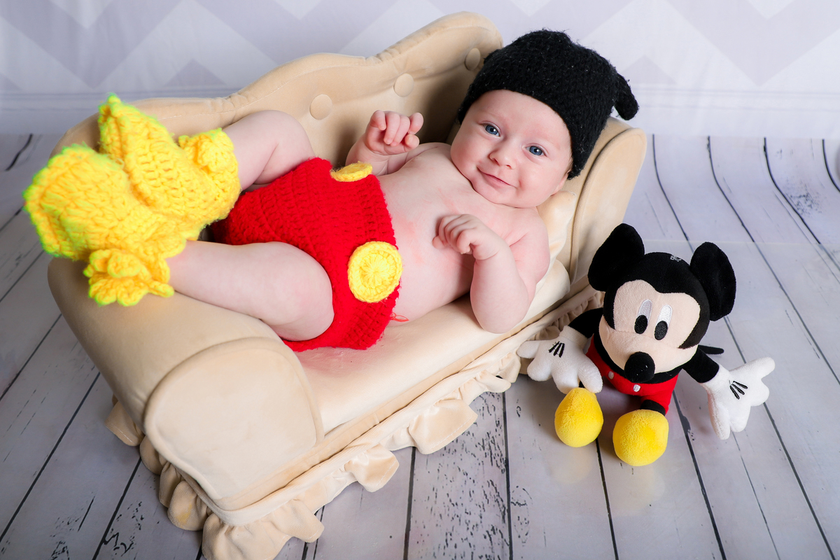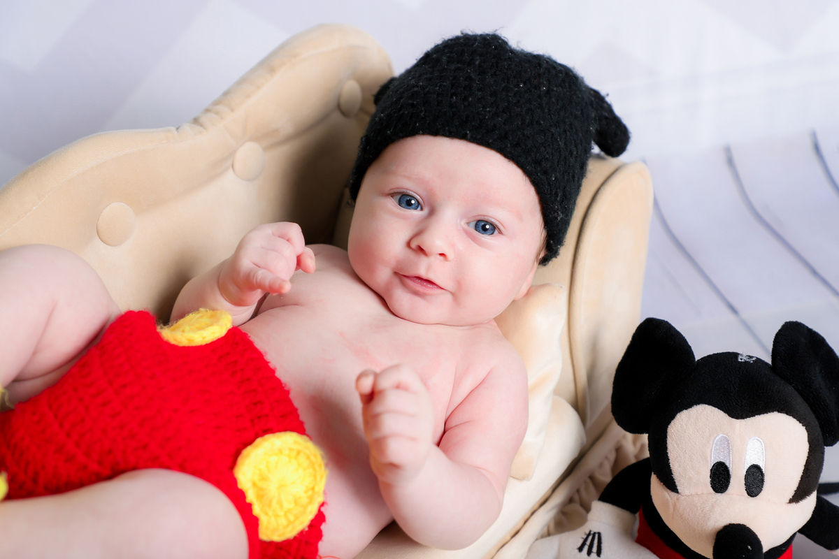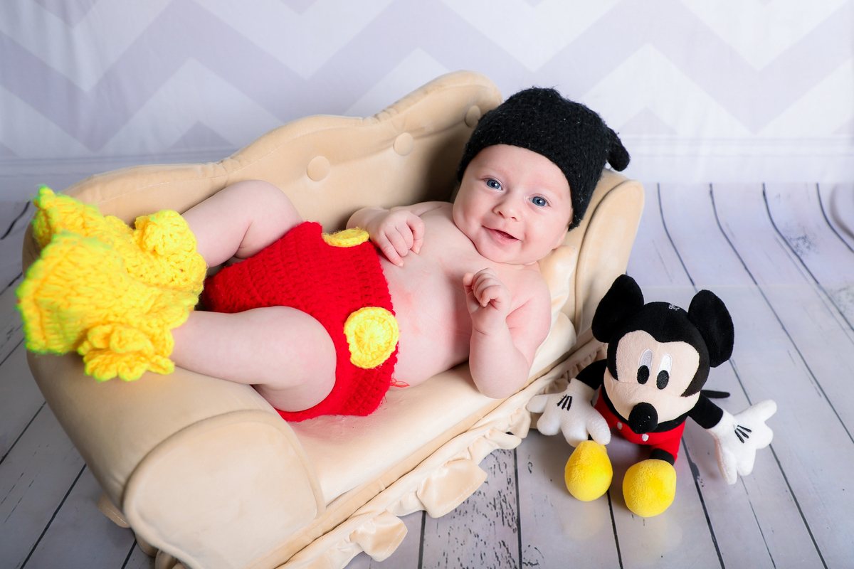 Ensaio mesversário do acompanhamento do Augusto de 2 meses no estúdio Abacaxis Fotografia de Maternidade em Limeira-SP. Tema do ensaio foi Mickey e cenário neutro.